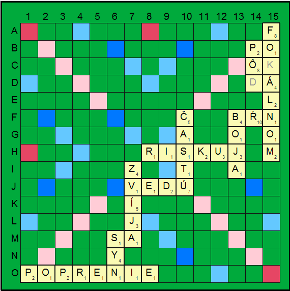 V sezóne 2018/2019 zorganizuje Slovenský spolok SCRABBLE dve písomné súťaže. Tie nebudú mať kvalifikačný charakter, ale výsledky oboch súťaží sa započítajú do Slovenského pohára. Víťazom 1. písomnej súťaže sa stal JAROSLAV VERNARSKÝ. Blahoželáme! Pozrite si jeho 733-bodové riešenie. 1. Jaroslav Vernarský (733 bodov) 2. Ivan Pastucha (718 bodov) 3. Jozef Gajdoš (702 bodov) 4. Gabriela Sládeková (692 bodov) 5. Július Alexy (633 bodov) 6. Miroslav Kiss (624 bodov) 7. Aexander Udvardy (622 bodov) 8. Patrik Pinter (603 bodov) 9. Ján Paco (594 bodov) 10. Vladimír Karaka (564 bodov) 11. Ivan Brodenec (543 bodov) 12. Daniel Mojžiš (522 bodov) 13. Cecília Telková (470 bodov) 14. Zdenka Žákovičová (426 bodov) 15. Andrea Vidová (418 bodov) |